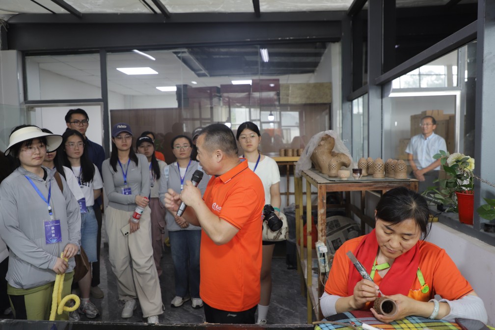 龍格黑陶藝術(shù)研究院內(nèi),傳統(tǒng)工藝與現(xiàn)代創(chuàng)新的完美融合。省級非物質(zhì)文化遺產(chǎn)項(xiàng)目代表性傳承人徐慶增老師帶領(lǐng)師生們參觀黑陶生產(chǎn)車間,他特別提到,濟(jì)陽黑陶以黃河泥為原料,經(jīng)選土、拉坯、雕刻、燒制等20余道工序制成,其“黑如漆、亮如鏡”的獨(dú)特質(zhì)感源于高溫窯變的自然反應(yīng)。現(xiàn)場演示了拉坯、雕刻技藝,手中的陶土仿佛被賦予了生命,在指尖的舞動(dòng)下逐漸成型。師生們在專業(yè)藝人的指導(dǎo)下,從揉泥、拉坯到成型,親自體驗(yàn)了黑陶的制作,最終創(chuàng)作出了屬于自己的黑陶作品。